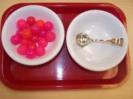 1. Hands & feet water work: Use an eyedropper to place colored water in small suction cups (sight/visual)2. Cedar ball transfer: Move balls from one bowl to another using a spoon (smell/olfactory)